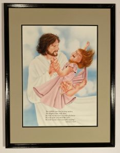 Reproduced airbrush painting, Jesus will rejoice over you. 13” by 18” (12.5” by 17.5” with border). Produced on Premium Presentation Paper MATTE, 44 lb., 9 mil. for dry mounting and framing (phasing out) or produced on Ultra Premium Presentation Paper MATTE, 51 lb., 10.3 mil. for unframed or framed.